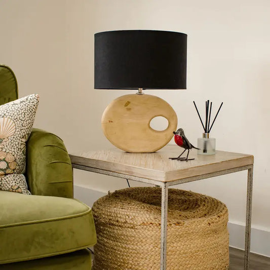 Badminton, Light Sandblasted Wooden Table Lamp with Black Cotton Shade - 44cm