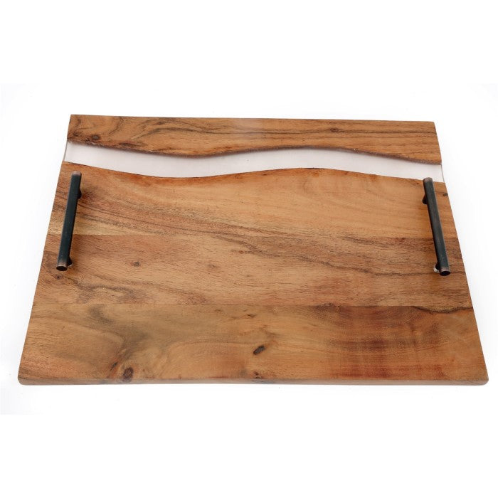 This striking Acacia wood tray has a clear polyresin wave running through it. It features two metal handles for easy carrying. This tray is food safe and can be used to serve food on or is striking enough to be used as a decorative piece.