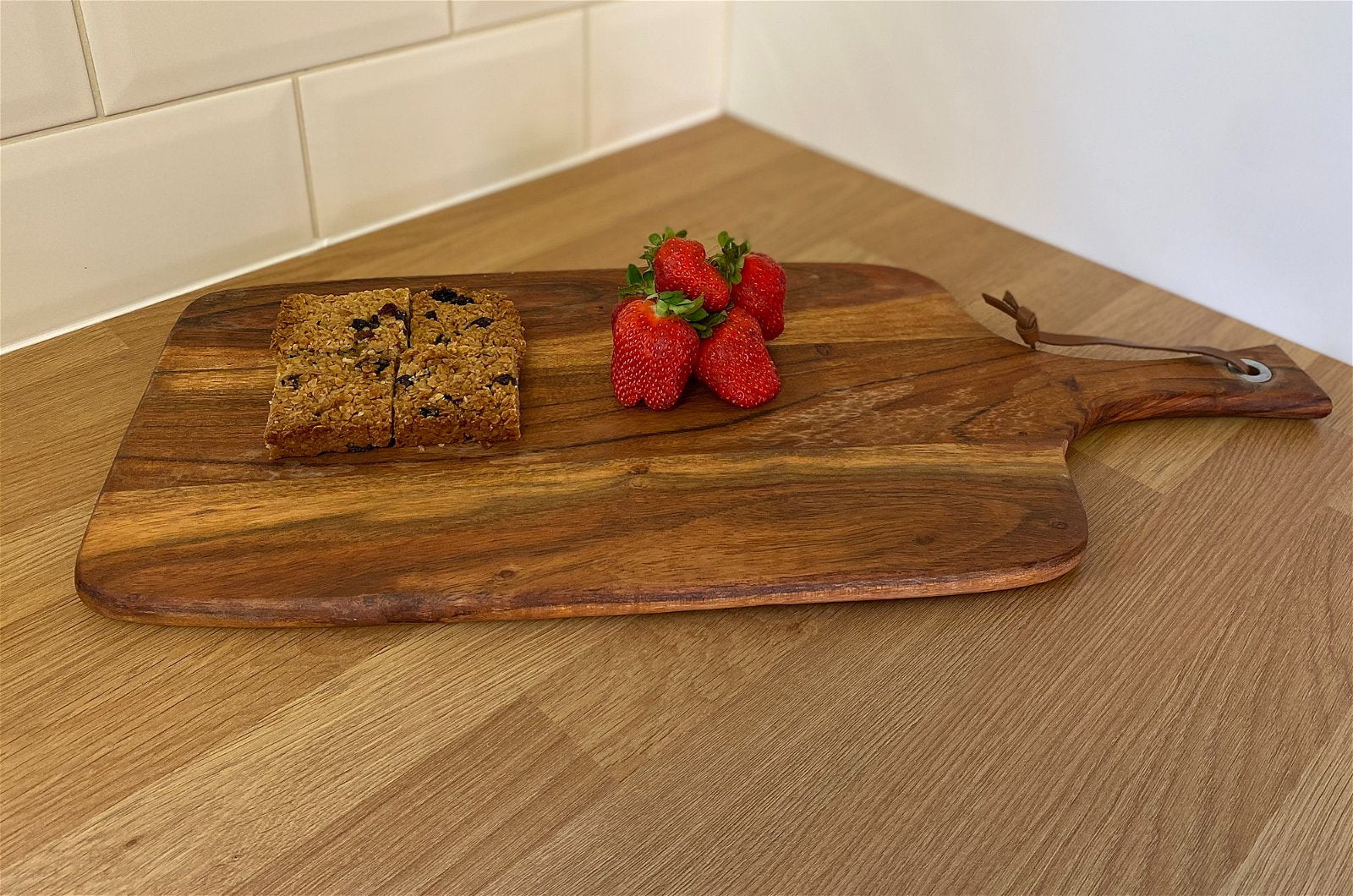 A crafted wooden paddle shaped chopping board. This elegant piece has a leather loop for hanging on any hook or wall, length 11cm. Certainly an item that would be functional and add charm to any home.