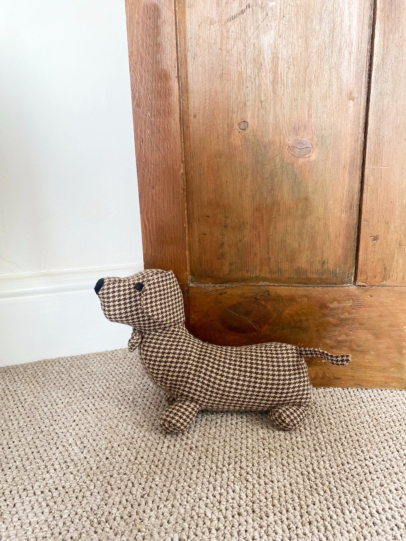 This sausage dog door stop would look at home holding open any door with its practical yet stylish design. The classic herringbone fabric with brown colour and natural detail is polyester and can be cleaned with a damp cloth. The item is weighted with sand to keep it in place and keep your doors open.
