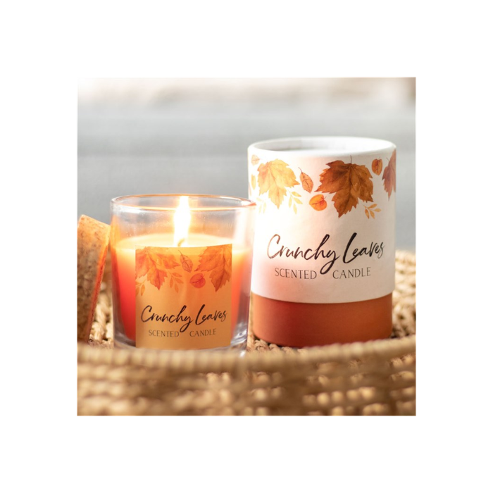 Cosy up on a chilly autumn day and enhance your home with this Crunchy Leaves fragranced candle. Glass holder with cork lid and beautifully presented in matching cardboard tube packaging. Vegan paraffin wax.