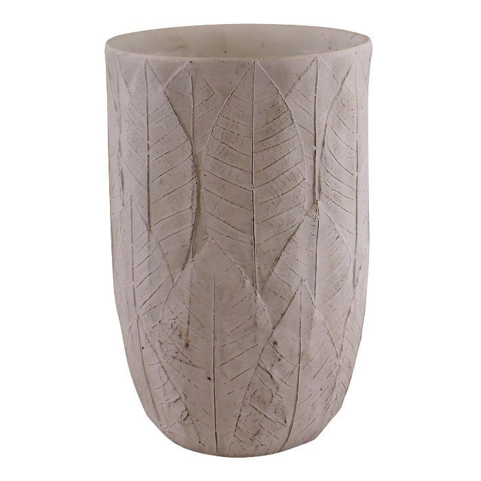 A simple and stylish design featuring embossed leaves on a white cement make for a beautiful vase for your home. Made of cement with an embossed leaf design. Protective pads to the rear to protect your furniture.