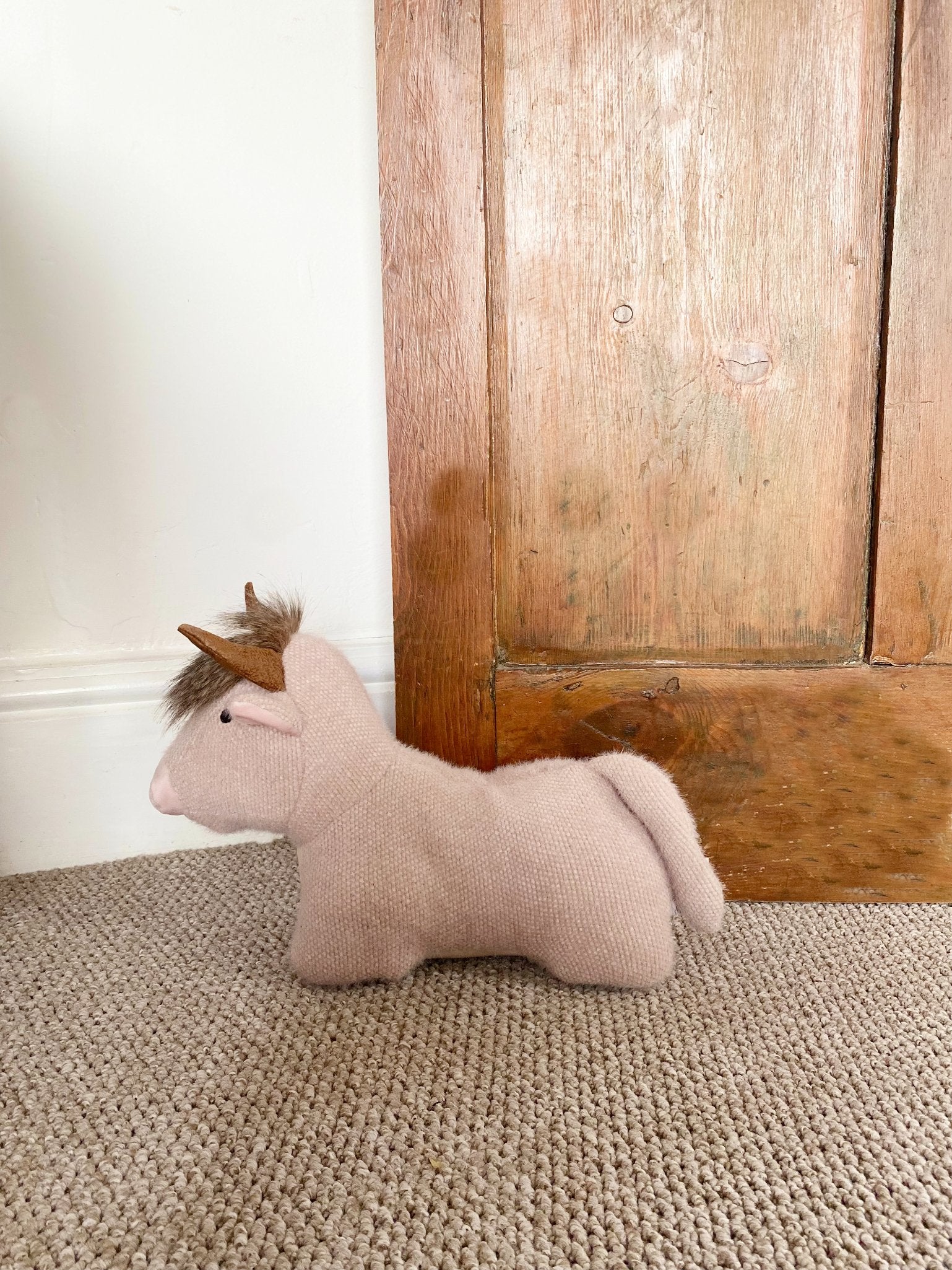 This cow door stop would look at home holding open any door with its practical yet stylish design. The textured dusky pink fabric with faux fur forelock and faux leather horn detail are polyester and can be cleaned with a damp cloth. The item is weighted with sand to keep it in place and keep your doors open.