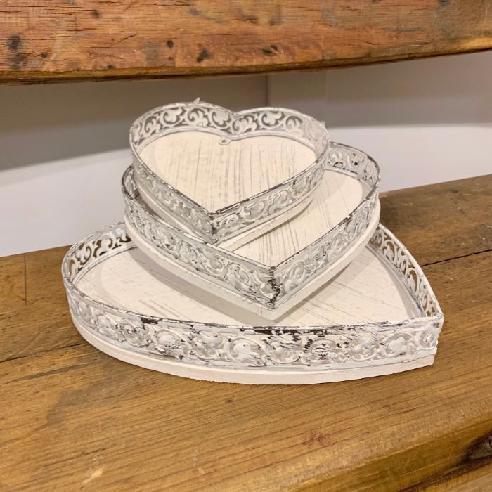 A lovely set of metal heart shaped vintage style white metal trays, with wooden bases, with a distressed white paint finish. The pierced metal decoration adds charm and elegance to these useful items.
